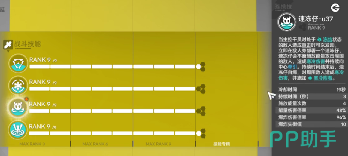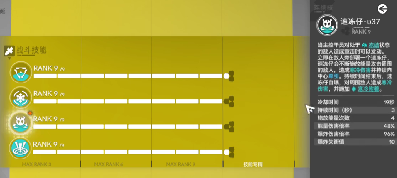 二技能可部署小型战术机器人,具备持续牵引控制能力;倒计时结束时自动引爆,造成范围伤害并施加「寒冷印记」。该印记不直接造成伤害,但会延长目标受击后的僵直时间,并作为关键触发条件,激活同属冰元素干员的增益效果——例如提升攻击速度、增强冻结概率或延长控制时长,从而强化整支寒冰队的元素协同效率。
