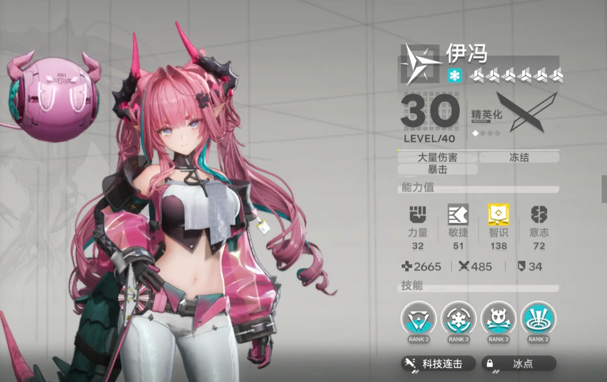 伊冯为女性干员,视觉设计以粉白双色为主调,突出轻盈迅捷的战术风格。其战斗体系严格围绕「冻结—破冰—协同」三层机制构建:普攻即附带1层冰冻状态,提供稳定硬控;当被冻结目标承受重击时,立即触发「破冰效应」,使该次伤害提升50%。该设定弱化了对基础攻击力的依赖,转而强调操作节奏与时机判断,属于典型的机制驱动型角色。