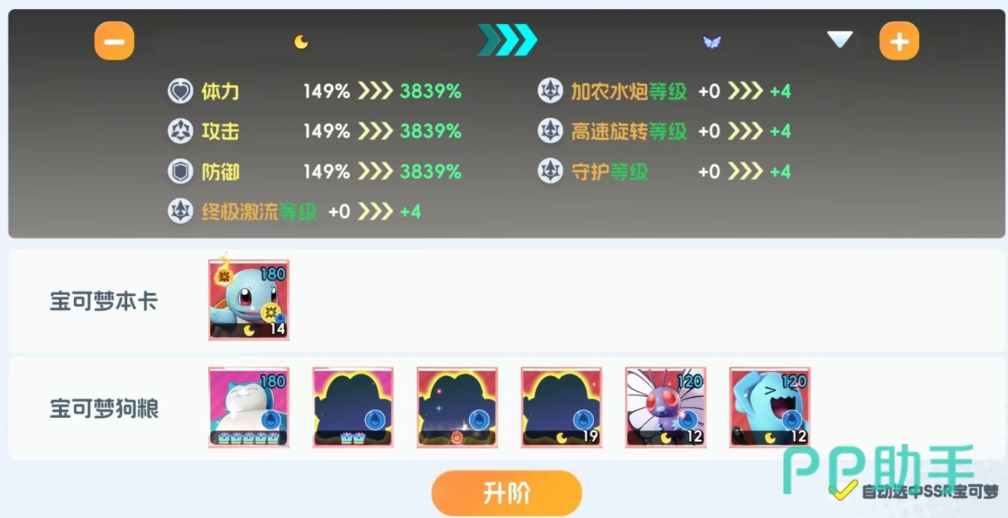 第一重门槛为升阶要求:目标宝可梦须从“月亮1阶”起始,逐阶晋升至“天使1阶”,全程共需完成16次升阶操作。达成此目标需消耗大量同系养成资源:包括14只同系“月亮1阶”宝可梦作为主升阶材料;另需1只“皇冠5阶”、2只“皇冠1阶”、1只“太阳1阶”及33只“月亮1阶”宝可梦作为升阶狗粮。全部素材必须与目标宝可梦属性系别严格一致,资源筹备成本极高。