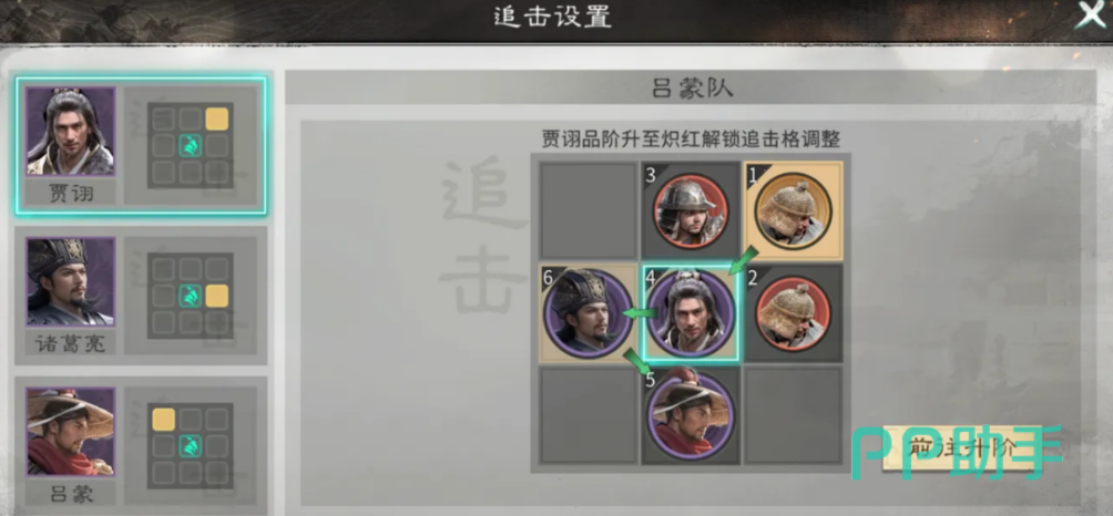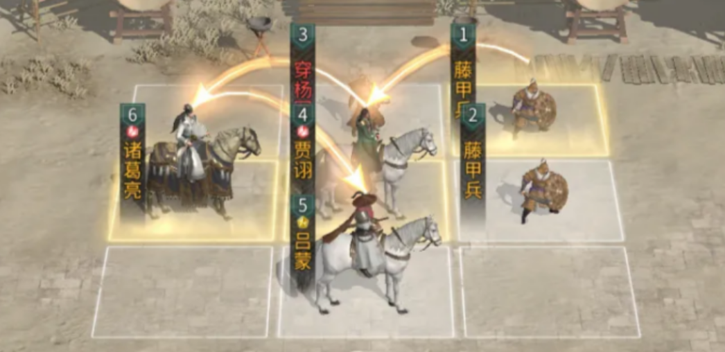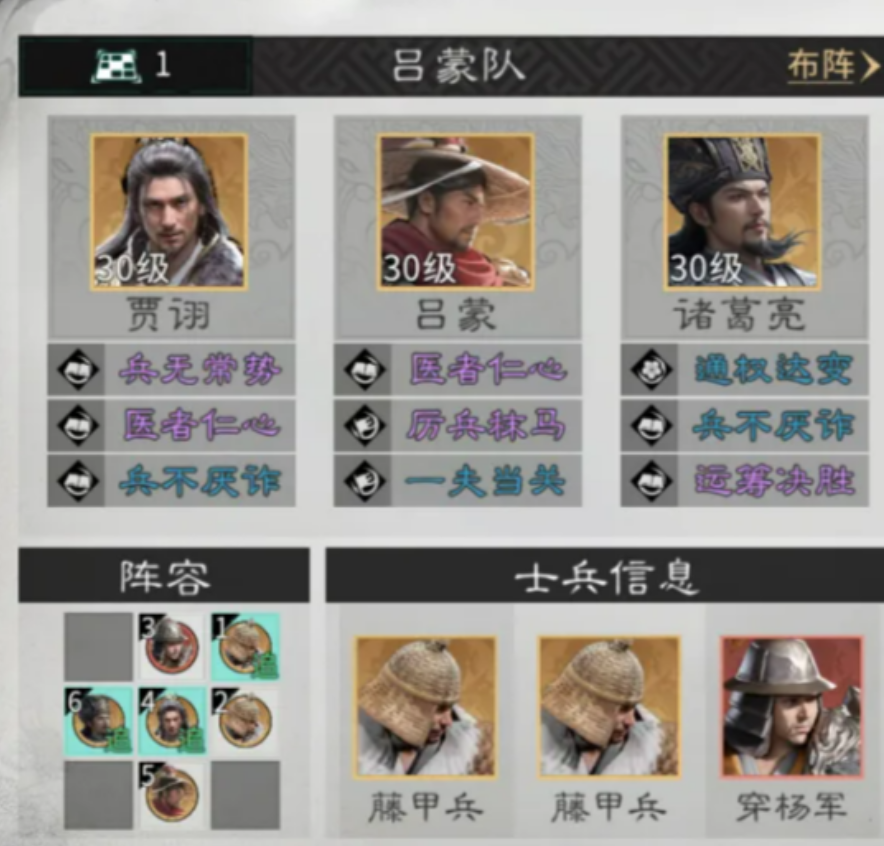 本阵容采用三层递进式布阵逻辑:前排由吕蒙担任主坦,需置于首格承担初始伤害,但不可占据追击格;诸葛亮必须严格部署于吕蒙的追击格内,贾诩则须紧接其后,落位于诸葛亮的追击格。此三格线性站位是激活全队追击机制的基础前提,直接决定控制链是否连贯、输出是否可持续。兵种配置方面,连弩军应置于贾诩正上方,形成远程火力支点;两支藤甲兵分别前置在连弩军与贾诩前方,构成双层物理屏障,有效削减敌方前排突进与AOE穿透伤害,保障后排核心输出与控制单位生存空间。