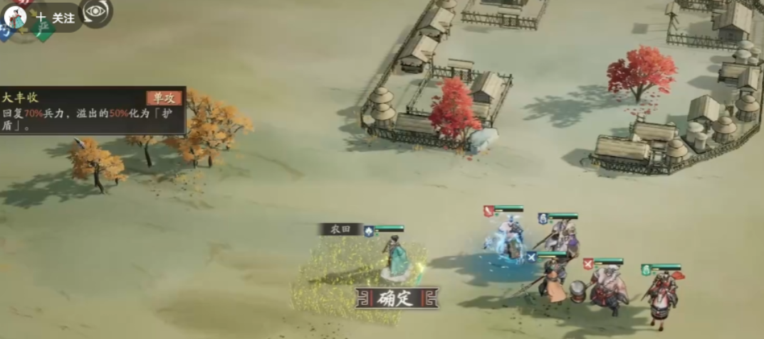 进入战场后,首要目标是迅速占领地图上的农田区域。农田可为部队恢复70%兵力或转化为50%护盾,这一增益效果在战斗后期尤为关键,尤其在兵力濒临耗尽时能提供重要支援。占领后应及时回血,为后续交战储备实力。开局阶段应避免兵力过度分散,在敌军逐步推进的情况下,可派遣部分武将主动出击,牵制敌方小股部队,打乱其阵型节奏,从而为我方主力创造进攻突破口。