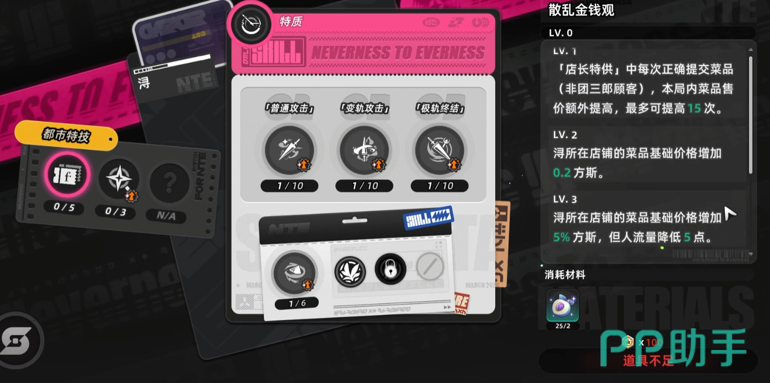 浔的核心机制围绕“经营反馈”与“能量积累”双轴展开。其被动技【散乱金钱观】可在每次成功提交菜品后提升单次售价,最高叠加15层;同时提升店铺基础菜价,虽伴随小幅人流量衰减,但整体收益呈显著正向增长。该特性使其在资源循环阶段具备不可替代的经济续航优势。