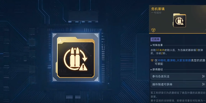 插件配置需兼顾资源循环、技能联动与伤害增幅三重目标。首槽推荐【危机装填】:当击杀距离控制在10米内时,自动补充3发弹药,显著缓解持续交火中的换弹压力;第二槽选用【多重击反】,每次射击均可为角色主动技能积累能量,加快关键技能释放频率;第三槽搭配【近距增福】,实现距离越近、增伤比例越高的动态加成机制;末槽锁定【终极插件】,启用后基础伤害提升100%,大幅强化对高血量目标的终结能力,尤其适用于BOSS战中的爆发窗口期。
