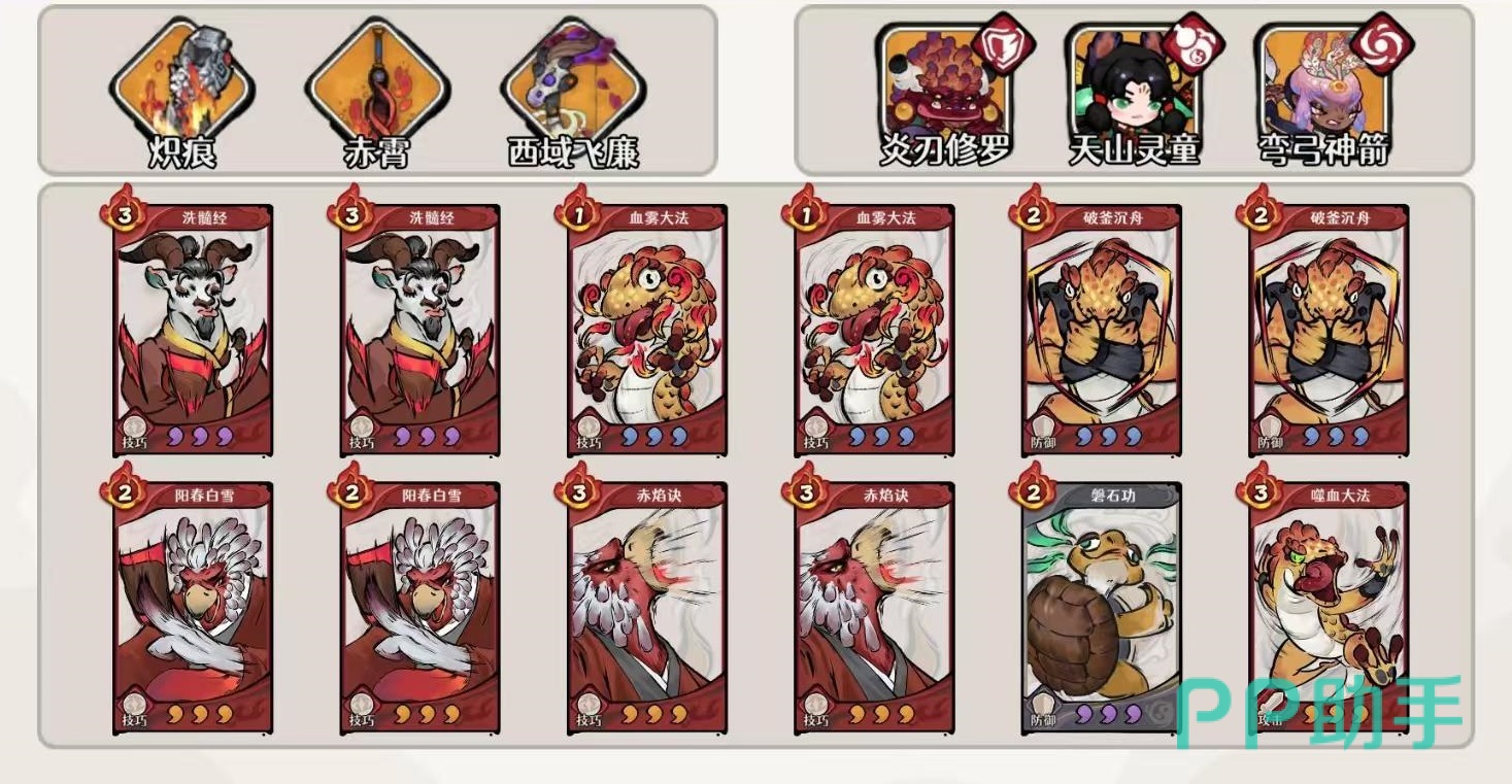 装备搭配方面,炽灵四件套(治疗加成20%,首次凑齐4张灼烧牌时恢复2点真气并抽2张牌)配合卧龙之袍,可最大化支撑自残循环与灼烧覆盖率。另存在火系爆发副路线:以天道剑圣与圣僧为双核,借灵童减怒与增伤能力加速灼烧叠层与真气技能释放频率,虽自动化体验更优,但综合输出强度与容错率仍低于主推的自残流,故不建议作为首选。