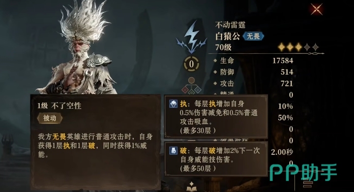 同时他还有着不错的生存能力,执和破可以看成是两个不同的buff,其中执每层可以增加0.5%的伤害减免和普通攻击吸血,最多能够叠加30层,这意味着随着战斗的进行,己方英雄在攻击敌人的同时,自身的防御能力和续航能力也会不断增强,而破则可以增加2%的威能技伤害,并且这个效果可以叠加50层,在面对强大的敌人时,这一技能的存在让大家的队伍在战斗中能够造成更高伤害。