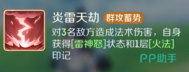 此外,群控兼输出技能“九龙冰封”可锁定四个目标进行打击,主目标还将承受额外增伤效果,同时为使用者叠加一层水法印记。而另一项高阶技能“炎雷天劫”则表现更为突出——它不仅能对三名敌人造成雷火混合伤害,还会赋予天宫“雷神怒”状态,大幅提升后续输出,并额外添加一层火法印记。这些技能彼此衔接紧密,构成了天宫多样化且富有节奏感的战斗流程。