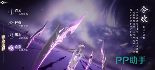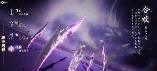 合欢职业在游戏中属于突进刺客类职业,操作难度是所有职业中最难的一个,但是对应来说,它的爆发和近战能力也是最强的。该职业的技能特效非常的绚丽,上限高下限低,不过手残党玩家不太推荐。