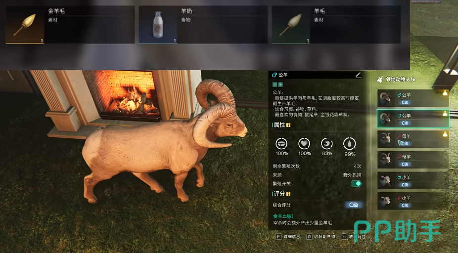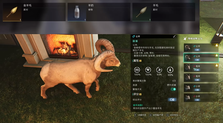 在抓到羊之后,玩家有两种处理方法,一种处理方法是直接对羊进行宰杀,这样有一定的几率可以获得金羊毛,另外还能产出皮毛等等其他不同的资源,需要注意的是想要获得金羊毛,那这只羊必须是高品质的血统。
