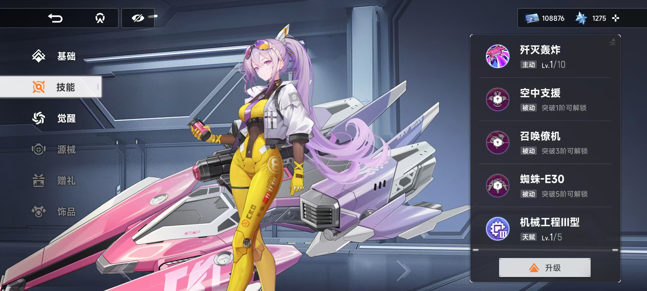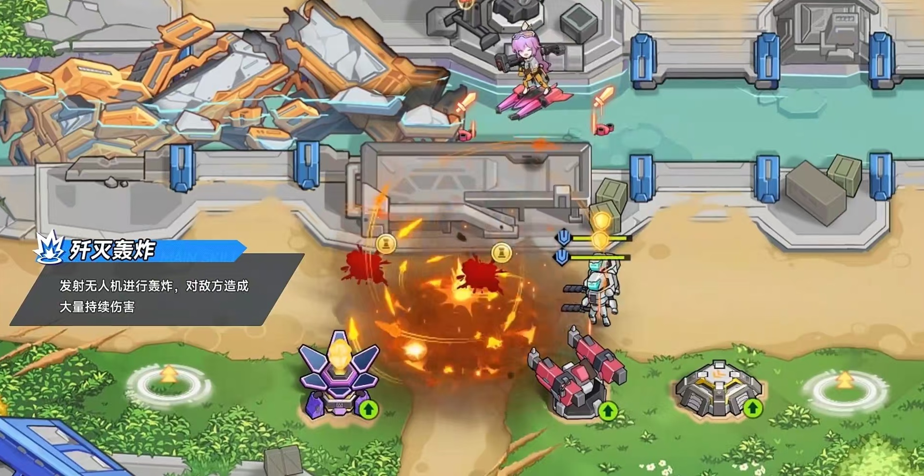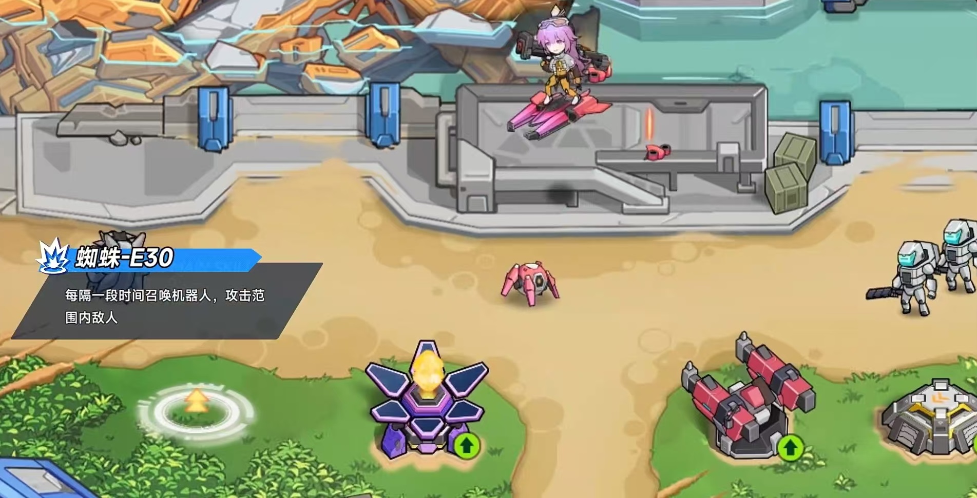 她的核心特质为高原增幅,具备出色的战场机动性,擅长空中滑翔作战。其第一个主动技能“歼灭轰炸”可通过释放无人机对敌方区域实施持续打击,虽然单次伤害偏低,但累积输出极高,属于典型的长效范围压制手段。第二个技能“蜘蛛E30”则拥有周期性召唤能力,能够部署自动攻击型机器人,这些单位会锁定周围敌人进行独立输出,有效提升整体火力密度。