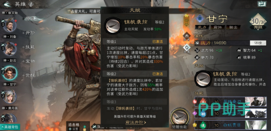 暴击流以甘宁为绝对核心主C,其定位为高速突进型输出角色。该流派首要优势在于“先手压制”——甘宁自带全队速度加成效果,并能显著提升队友属性成长效率。例如,当搭配黄月英时,可稳定触发其技能三选一中的关键增益项,大幅提升队伍整体移速,同时干扰敌方行动节奏。若再引入诸葛亮,则可激活专属羁绊,觉醒后不仅治疗量显著提升,还能削弱敌方增益状态持续时间,为甘宁创造安全、高效的输出窗口。