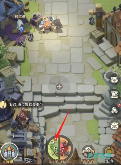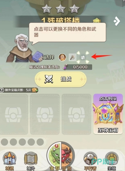 游戏本身是支持职业更换的,而且开局这个功能就已经得到了开放,想更换的话,你首先得来到主页点击下方绿色的“生存”选项,点击之后就会来到如下图所示的残破塔楼界面,这本身是一个爬塔的玩法。