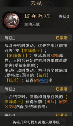 实战节奏上,该阵容强调先手压制。袁绍与高顺的召唤单位在己方回合内即可完成部署并参与行动,实现“武将+召唤物”双线输出,在敌方尚未出手前完成多段打击。尤其在高顺技能覆盖下,我方单位格挡率提升直接增强召唤物存活周期,而更长的存续时间意味着更多回合的累计召唤量,进一步放大兵力差优势。