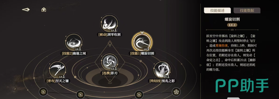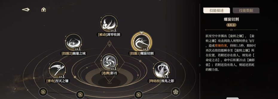 1技能名为螺旋切割,这个技能需要伊蕾什安对敌人投掷自己的武器镰刀,敌人会受到镰刀带来的飞行伤害,技能的攻击时间只有1.5秒,在这个攻击的持续时间内,只要不断的点击技能,我们就能闪现到镰刀所谓的位置,若是周边出现了对手的话,还可以进行命定攻击,只要命中对手就能获得幽影值。