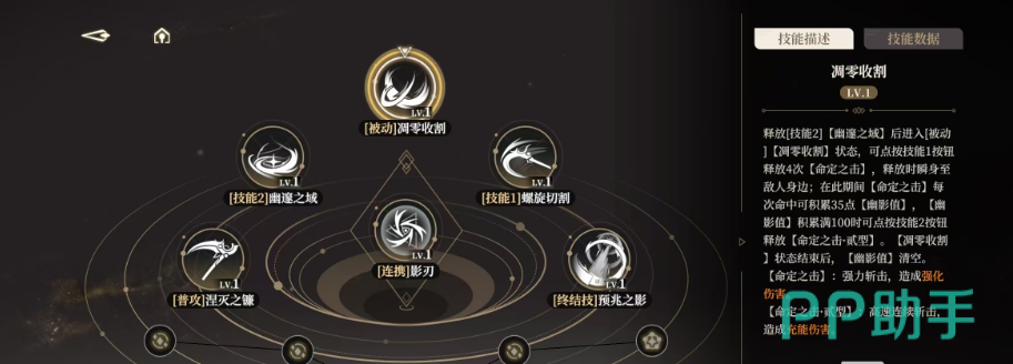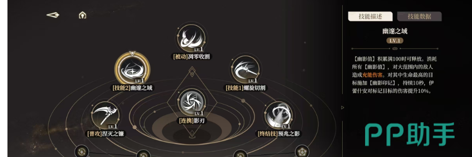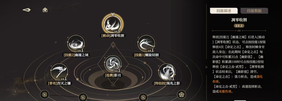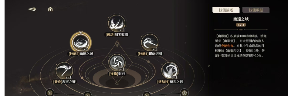 3技能名为凋零收割,这也是伊蕾什安的被动技能,该技能一旦被释放就会立刻进入到收割的状态,在这个状态下可以不断的用命定之击攻击对手,连续点击4次命定之击还可以直接瞬移到敌人的跟前,使用凋零收割技能,每一次打到敌人都能获得35点的幽影值,当幽影值累计满了后,还可以使用二形态的命定之击。