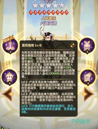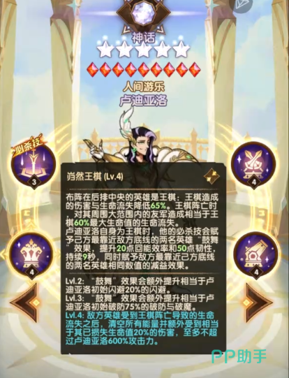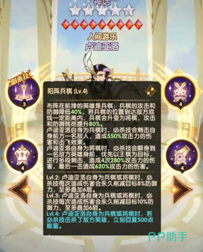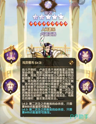 卢迪亚洛在游戏里属于一个神话级别的角色,角色的大招名叫戏弈棋布,在对战开始的时候,这个角色可以立即使用必杀技,并且角色是不需要消耗能量的,在使用这个技能的时候,角色还能获得免疫控制的效果,另外这个角色并没有严格意义上的放置位置限定,放置在前排角色就是近战,放置在后排角色就是远程攻击,另外等角色提升到2级之后,释放必杀技只需要消耗800点即可,角色提升到3级之后,消耗600点就能使用必杀技。