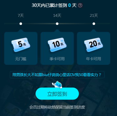 对于价格问题大家也不用担心,biubiu价格很实惠,月会员只需花费一杯奶茶的费用。如果你是新用户,还能享受到最低15元起的充值优惠。而老用户也可以坚持参加签到领取优惠券的活动,最低只要签到7天就能领取5元的无门槛抵扣券,实实在在的省钱。