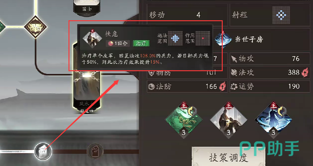 值得一提的是,步练师还拥有提升主将法术攻击力的效果,这对于以法术输出为核心的英雄如荀彧、郭嘉等具有显著加成作用。配合荀彧的技能机制——“扶危”,可在单体治疗基础上附加基于自身法术攻击108%的兵力恢复,并额外提供15%的治疗效果增益,使其下一次治疗更易实现满血复活。