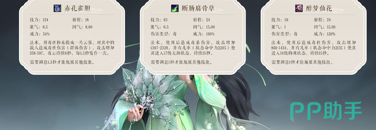 实战连招推荐以赤孔雀胆起手维持基础毒伤覆盖率,穿插九心海棠拉扯距离并补充伤害,再适时释放醉梦仙花与断肠草构建攻防双增状态。进入中后期,随着层数叠加与减防效果持续生效,毒系持续伤害将呈指数级增长,足以应对各类高血量、高抗性首领目标。