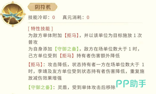 说到【拒马】,这可不只是李靖用来单纯攻击敌人的工具,它还是他整个战斗策略的核心之一。李靖的“阴符机”技能会为敌方附加【拒马】状态,简单来说就是让敌人的攻击力减弱。与此同时,他还能够为自己加上【守御之备】,为自己披上了坚固的防御盾牌,这个盾牌会在受到单体攻击时移除,但有一个关键点——如果敌人有不止一个单位存在,【拒马】的减伤效果就会越来越强。这就意味着,李靖的防守不仅仅是单一的盾牌,而是一个层层递进的防御网,越是敌人数量多,李靖和队友的保护就越强。