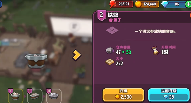 当大家在升级的时候也有一些小技巧,可以根据游戏里面的资源去获取,然后就合理的安排升级的顺序。如果一开始着急需要铁块去完成任务或者是打装备,就可以选择先集中升级其中的一个篮子。如此就能快速的得到所需要的铁块,要是时间比较充裕,也可以选择一个个去升级,如此就能稳步的提升容量。