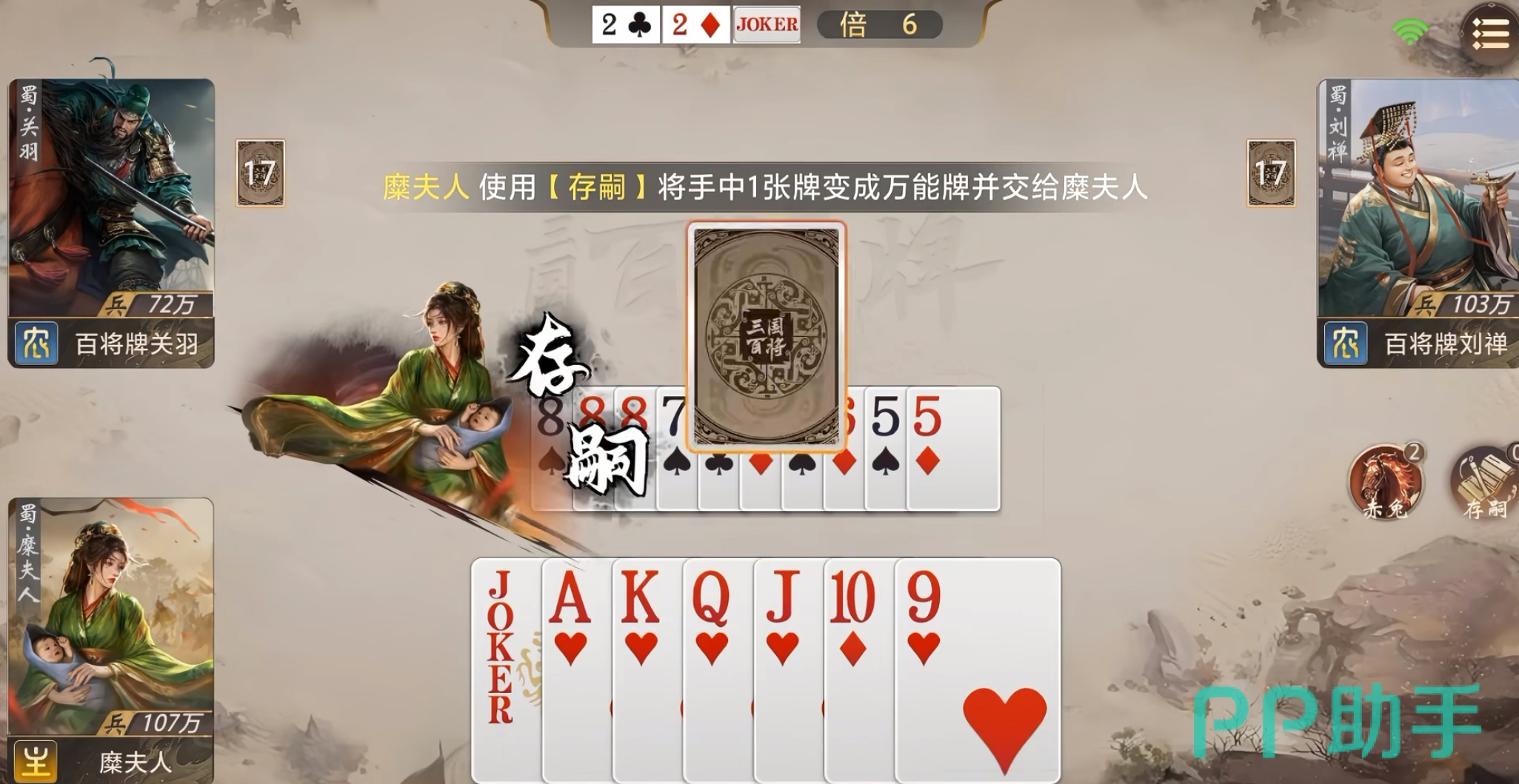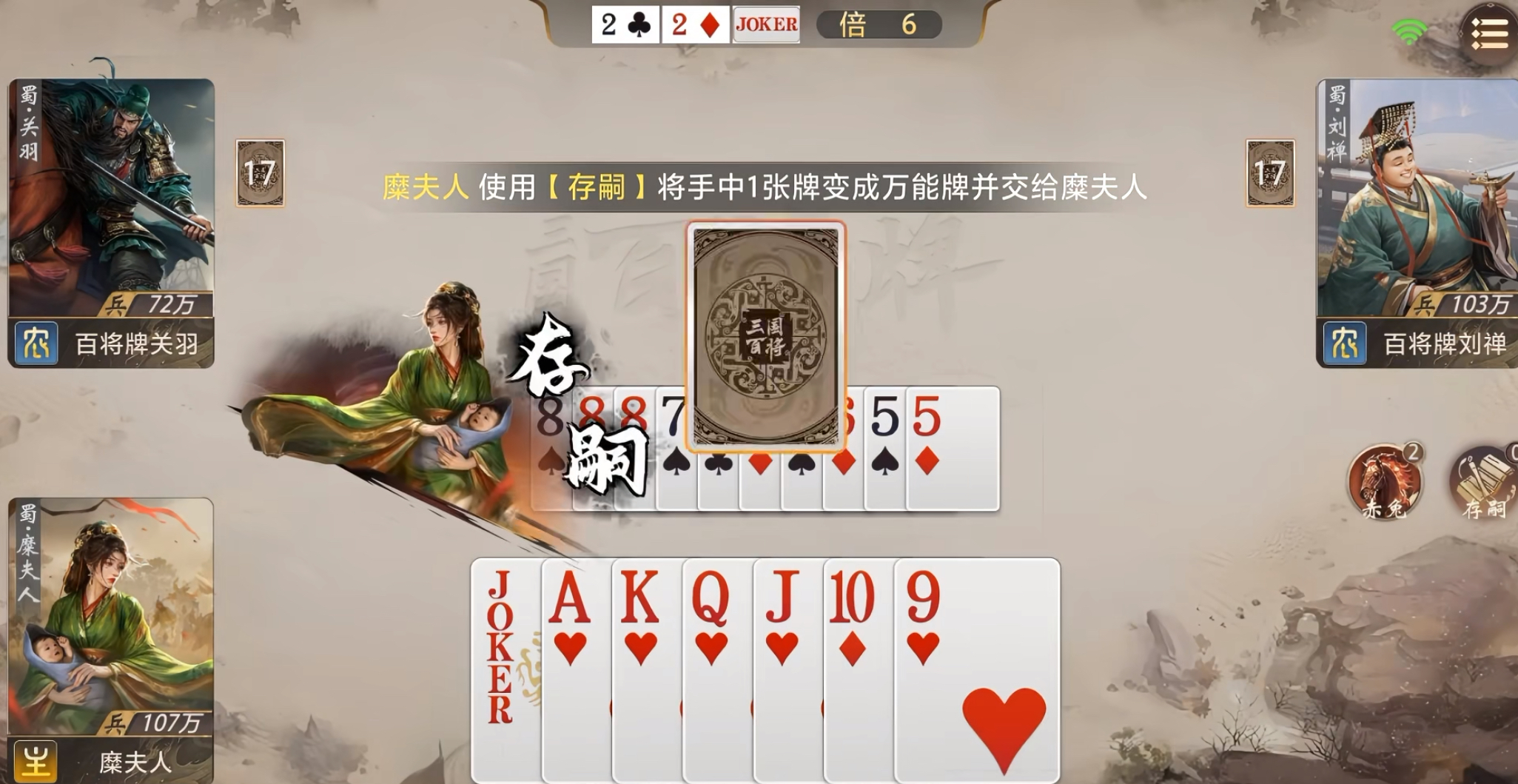 糜夫人的战略价值集中于“节奏调控”与“资源再分配”两大维度:一方面可通过快速过牌压缩自身手牌数量,抢占【存嗣】先机;另一方面以【万能牌】为支点,强化己方牌型完整性或干扰对手牌组构建。若己方拥有糜夫人,应主动配合其出牌节奏,协助其尽快达成≤8张条件;若对手使用糜夫人,则需通过压制性出牌延缓其手牌数下降速度,并在其触发【存嗣】后重点防范万能牌与炸弹、顺子等高阶牌型的组合,尤其警惕可能形成的“五星炸弹”等高爆发终结形态。