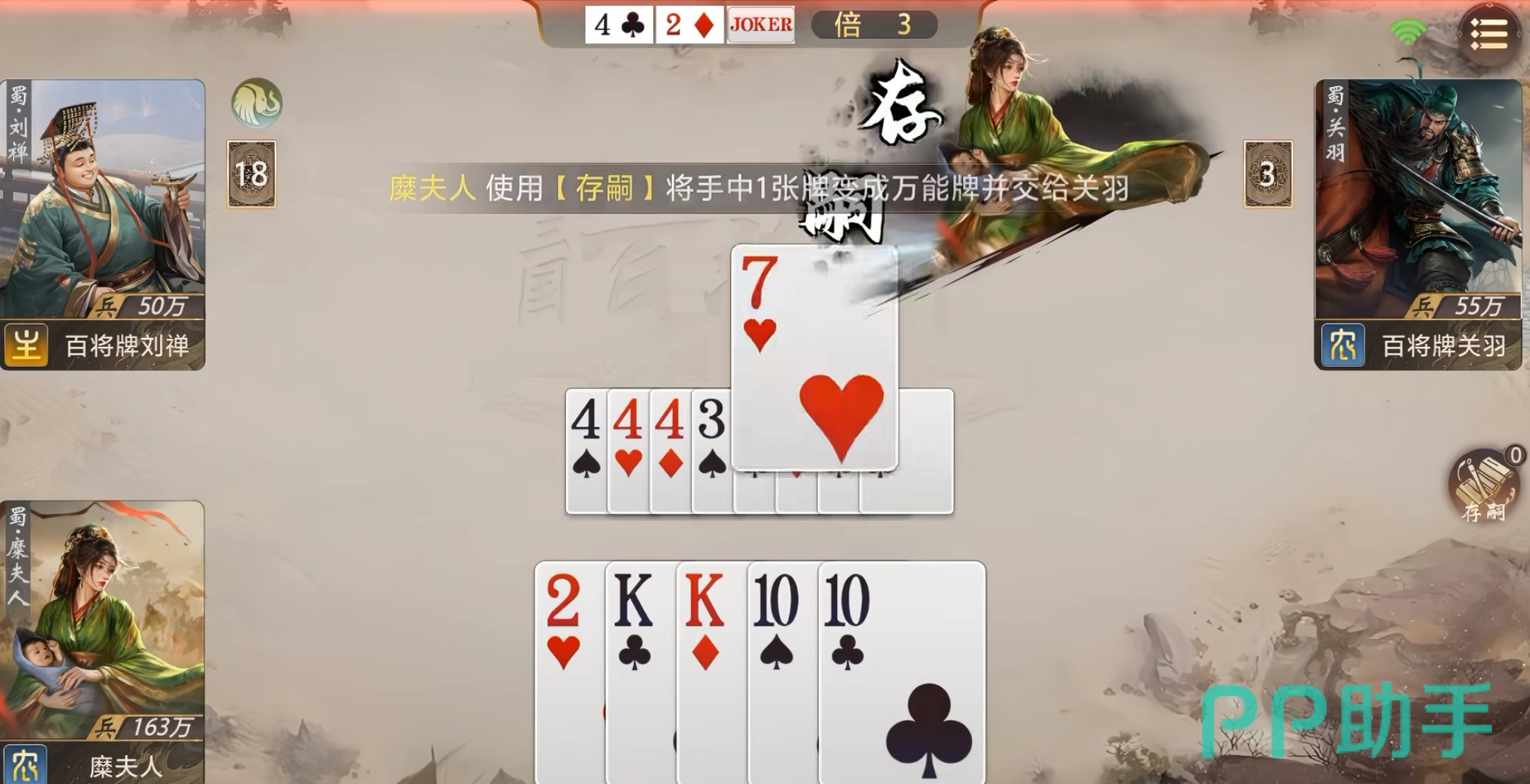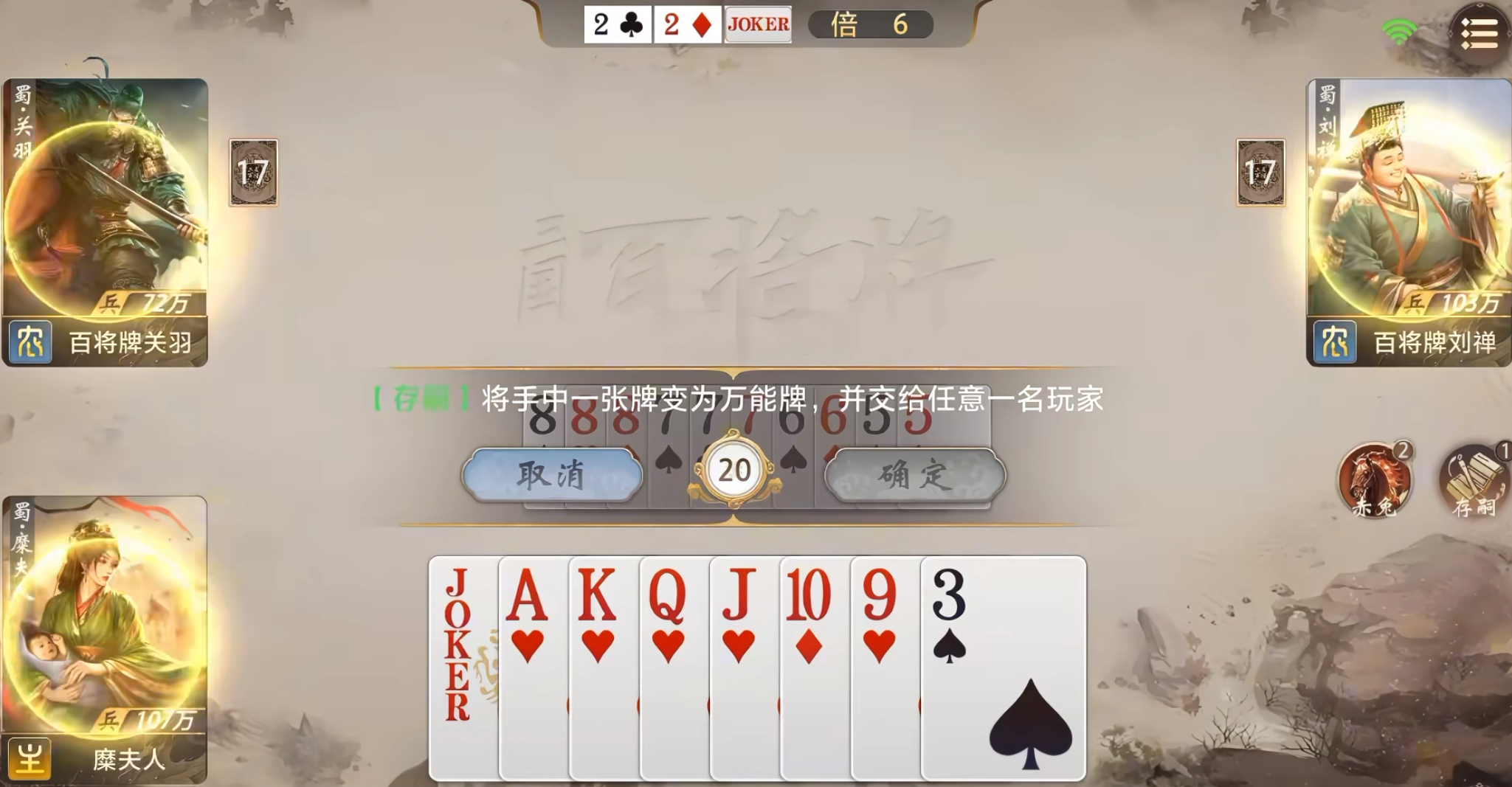 实战中,若起手持有连对、三带一/二或五张以上顺子等高效过牌组合,建议优先抢地主。通过主动控场加速清空手牌,可快速满足≤8张条件,提前锁定【万能牌】使用权。需注意保留高价值牌型如炸弹、大对子,避免在触发前耗尽关键组件,造成“有万能牌却无成型牌型”的被动局面。当糜夫人处于农民阵营,且队友为关羽、赵云等同样具备万能牌获取能力的武将时,可将【万能牌】定向交付,大幅提升组合王炸、长顺子等终结型牌组的概率,形成压制性收尾优势。