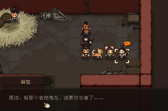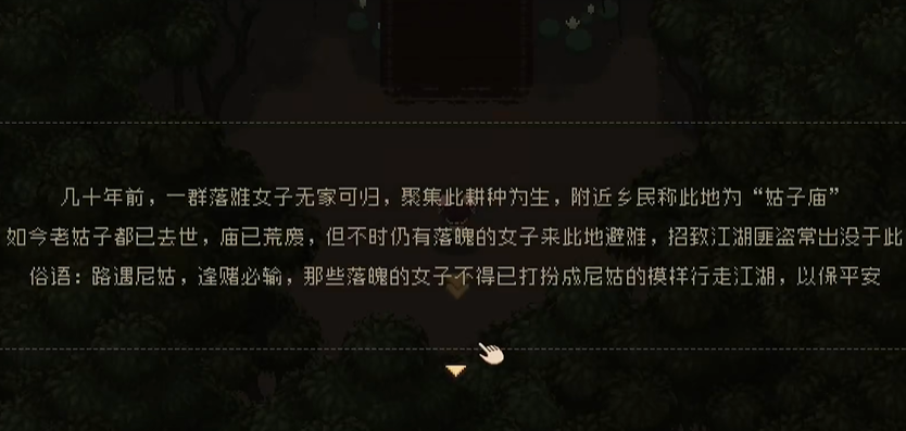 第二个就是江湖路线,玩家在江湖游历过程中,来到姑子庙这个场景,在这里会触发一段剧情,看到麻姑身处困境,面临一些歹人的骚扰或是危险处境,面对麻姑的困境,游戏会给出几个不同的对话选项,玩家务必谨慎选择,只有挑选了代表正义、善良且愿意救助她的选项,才能成功救下麻姑,同时自身的道德值也会因此提升,这一步为后续麻姑的加入奠定基础,成功救下麻姑后会对玩家心怀感激,并告知玩家一些后续的线索或请求。