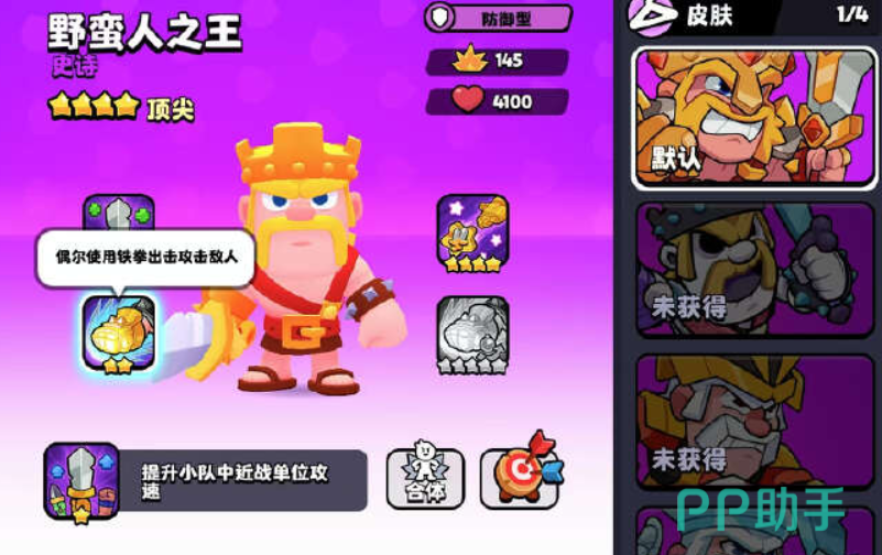 野蛮人之王这个角色,作为一个血量非常高的英雄之一,他可以利用自己的剑来对敌人发起猛烈的进攻,作为一个专注于防御的角色,大家可以使用他的技能来提高队伍的攻速,最高可以提升23%,如果人数越多,那么提升的效果就会越强悍,还可以利用铁拳来攻击敌人,每十秒可以来进行蓄力造成240点的伤害,还可以更好的击退对手,最后一个技能是超级狂暴法术,可以利用这个技能来不断的输出,作为一个非常优秀的角色之一,在队伍中是一个中坚的力量不断的培养。