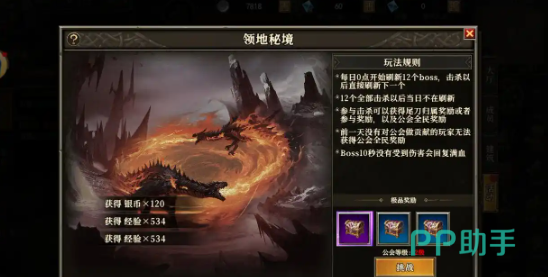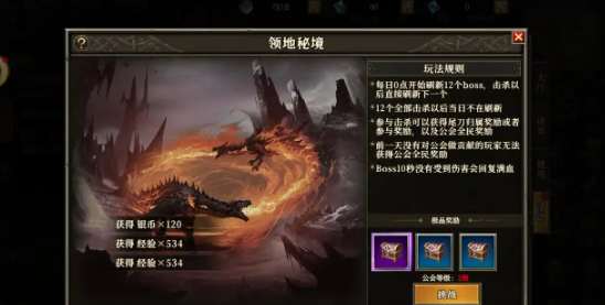 另外别忘记还需要去挑战公会领地秘境,每天可以挑战12次,在凌晨零点时就会重新刷新次数。在这一个秘境里面有12个boss,在每一次打倒其中一个boss之后,下一个就会马上刷新,而等到12个全部打完之后就不会刷新。在这个地方就可以获得高阶秘境宝箱里面就是宠物碎片,运气好的话就可以获得强力的宠物。