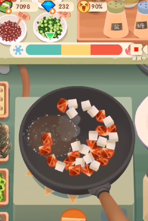 在豆腐被酱油成功染色之后,玩家就可以将番茄加入在锅中。后续玩家要尽可能的进行颠勺,保证所有的食材都受热均匀,将食物煸炒熟后玩家加入两圈的盐,进行小幅度的搅拌,一道三星级完美【一剪梅】就制作成功了。