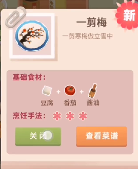 在游戏中玩家制作的菜品星级越高说明玩家的制作过程越详细合理并且味道越好,顾客给予的小费金币就会越多。【一剪梅】在游戏中生一款豆腐类菜品,所需要的材料都是比较普通的食物。【一剪梅】的菜谱为:豆腐、番茄、盐、酱油。