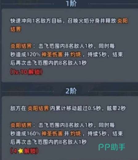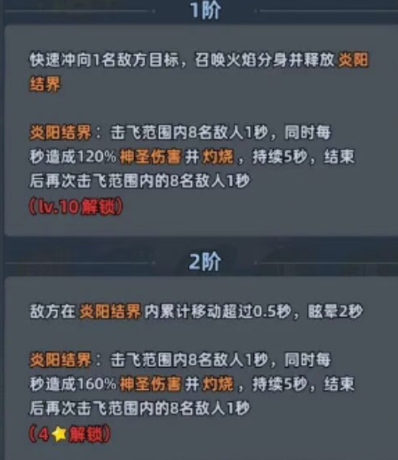 二技能为多阶成长型位移控场技:基础形态下,炽焰舞姬突进至目标区域,召唤炎阳结界,对范围内至多8名敌人造成单体伤害并施加1秒击飞;结界存在期间每秒附加120%倍率神圣伤害,持续5秒,结束后有概率再次触发覆盖8人的击飞效果(仅限1次)。升至二阶后,凡在结界内累计移动时间≥0.5秒的敌人,将额外承受2秒眩晕;升至三阶时,该眩晕延长至3秒。此机制几乎无需预判,只要敌人产生位移即可稳定触发,显著提升团控覆盖率与节奏主导权。