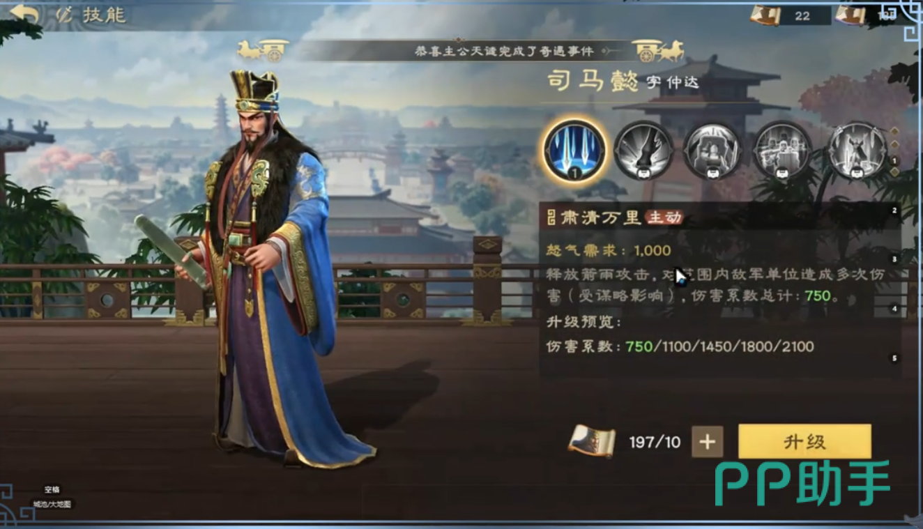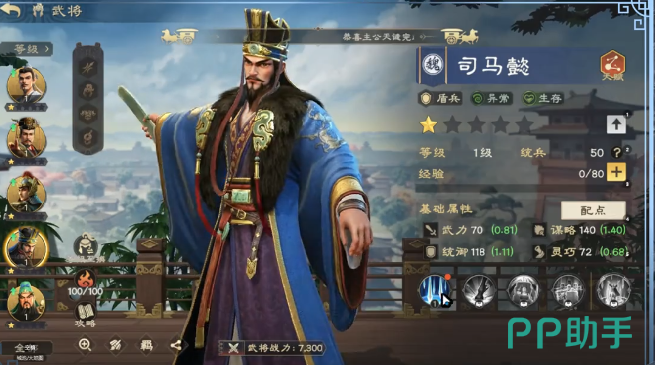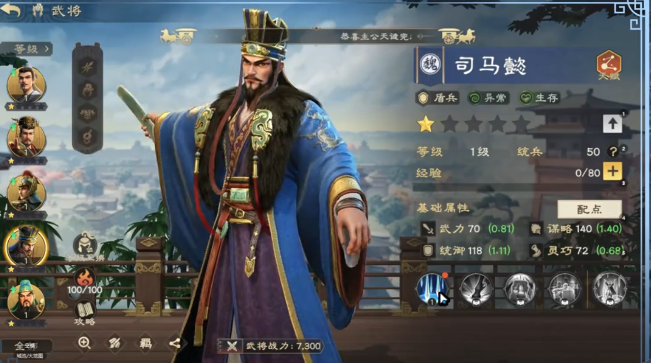 在武将界面可以找到司马懿,其初始属性为武力70、谋略140、统御118、灵巧72,整体配置均衡且偏向策略输出方向。他的核心技能以范围性多段伤害为主,随着等级提升,技能伤害逐步增强。随着角色进阶与技能解锁,司马懿将获得更多的战术选择,在团队中的战略地位也随之提高,尤其适合需要持续压制对手的对局环境。