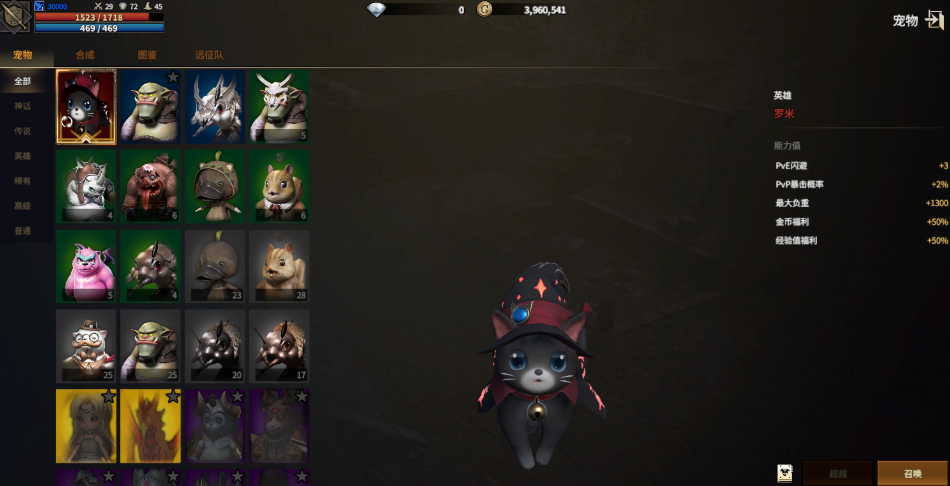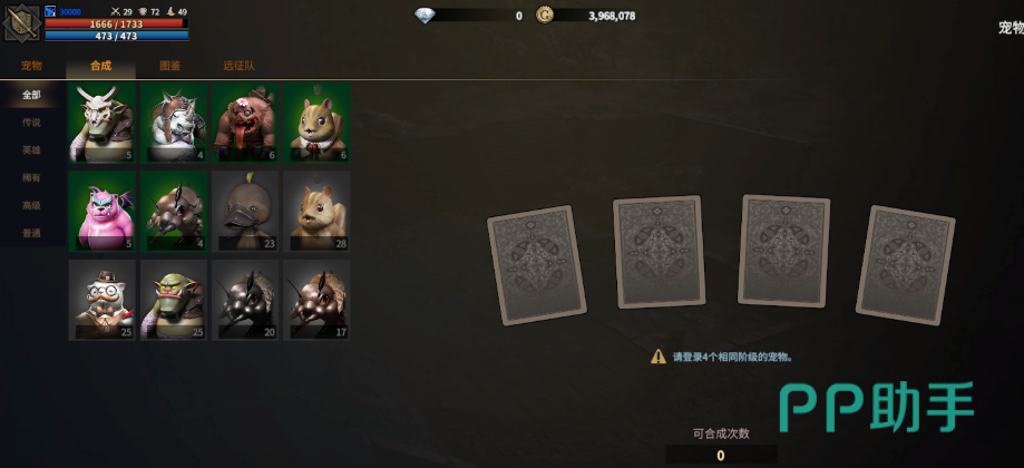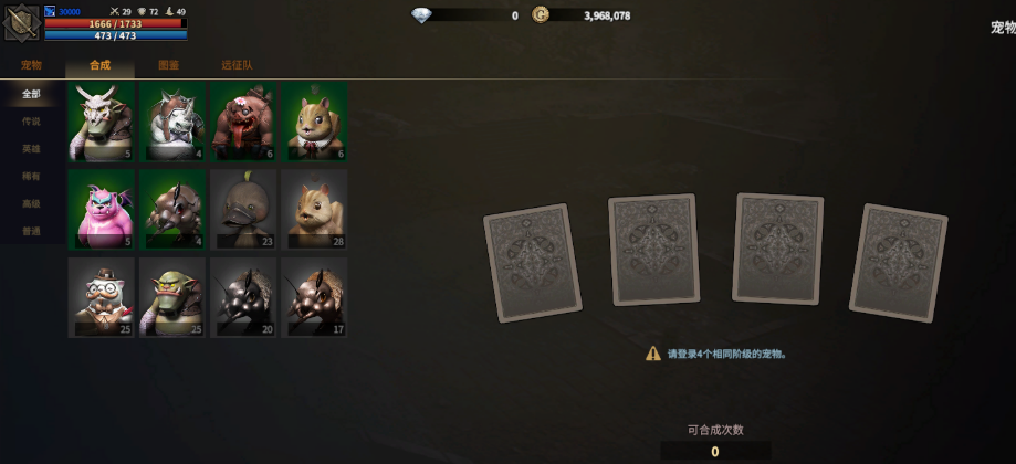 宠物按稀有度划分为蓝、红、紫、金四个品质层级,其中蓝色为初始品质,金色为顶级传说品质。品质提升依赖合成:4只同阶蓝色宠物可合成1只红色;4只红色合成1只紫色;而2只紫色即可合成1只金色。品质跃迁后,基础生命、攻击、防御等属性将获得阶梯式增长,且高阶宠物解锁的专属技能效果更显著。