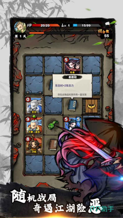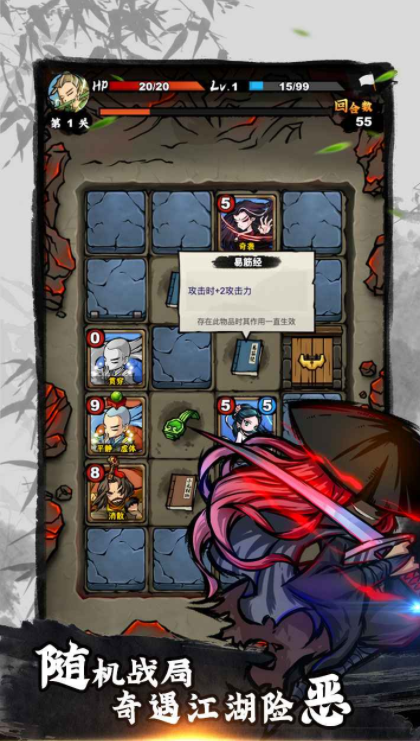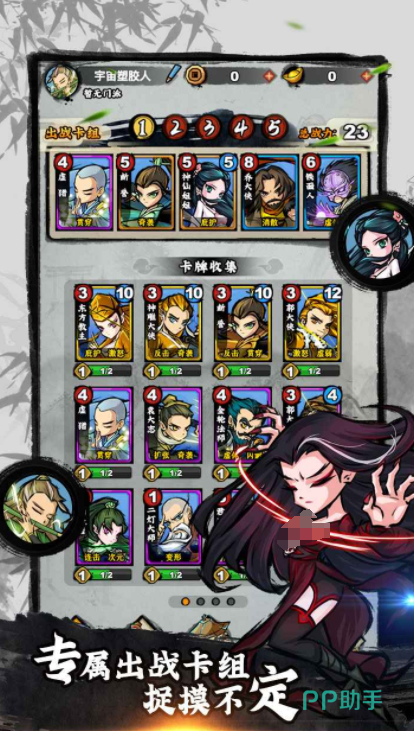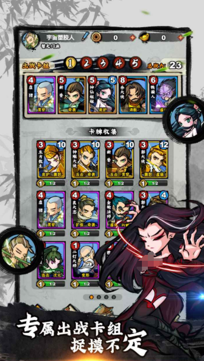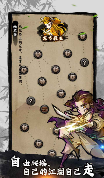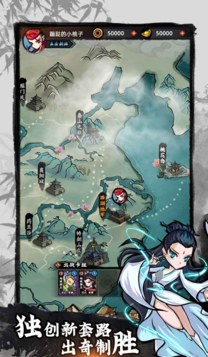 游戏里会设定一个庞大的地图,玩家需要分别进入到这些地点开启挑战,为了能让对战更加轻松,里面会设定卡牌玩法,在游戏开始之后,玩家可以自由的去组合不同的卡牌角色,这样把他们组建成卡组之后,就可以依靠角色不同的能力,不断展开对战,另外在游戏里还有自由爬塔的设定,需要和各个江湖大侠不断展开对战,既能通过这种方式证明自己的能力,又能学习到更多的武功。