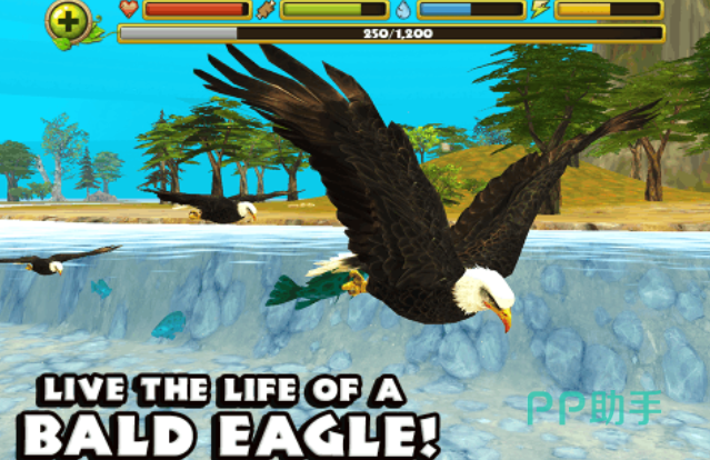 这款模拟老鹰的游戏具备很纯粹的飞翔冒险玩法,你将化身雄鹰在浩瀚的天空中游荡,不仅可以自由抓捕猎物觅食提升等级,甚至可以孵蛋获得各种能力的老鹰宝宝,游戏使用了UNITY引擎技术打造呈现的极为真实,狩猎跟养成类的任务极为丰富提高了耐玩性,完全模拟了老鹰生存状态和飞行动态,鸟类模拟器爱好者不妨化身雄鹰进行冒险。