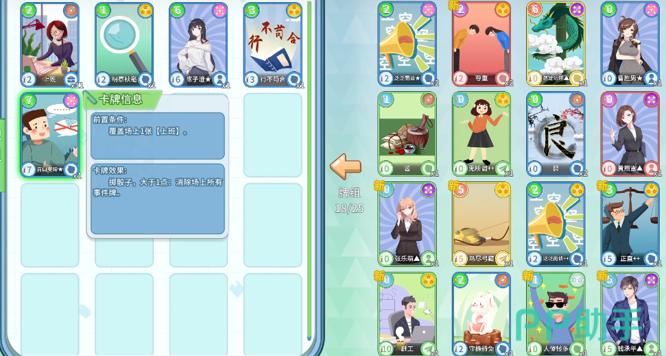 作为一个真实的职场游戏,除了工作的挑战之外,还有各种人际关系,可以选择直接应用这些卡牌,让自己在职场上更加游刃有余,就比如使用老好人卡和上班卡,这样既能工作同时又不会导致出错,有了好人卡池或者游戏进度也会更快一些,但一直当老好人容易给别人做嫁衣,想让自己手里的项目尽快完成的话,就可以使用加成卡提升自身的绩效。