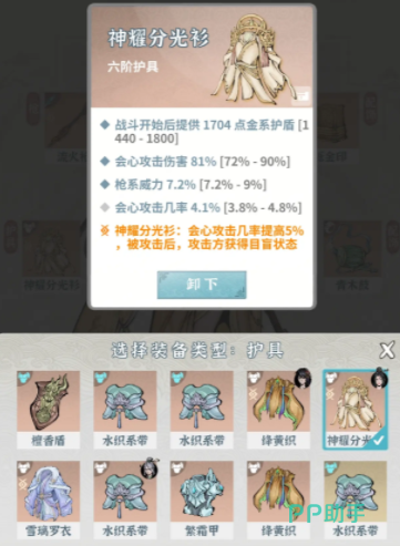 除了心法之外,护具也是需要玩家合理配置的,这个角色是一个擅长近战的角色,所以在挑选护具的时候,要选择带有强防御能力的,就比如神耀分光衫,在战斗的过程中能够提高攻击,并且有很强的防御能力,如果在穿戴这个护具的过程中,受到对方攻击,还可以触发目盲状态,玩家有机会在这个时候及时进行反击。