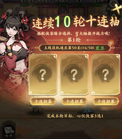 开局阶段,优先锁定「疯狂百抽」活动——这是前期获取高适配侠客的核心入口。该活动在主线推进至20级后正式解锁,入口位于「闯荡江湖」副本界面。百连抽不仅提供稳定数量的可用侠客,还同步激活「词条任务」,完成即可随机领取一名侠客。虽不可指定目标,但高级侠客掉落概率显著优于常规招募,是开荒期战力奠基的关键一环。获得优质侠客后,可立即投入「游历」系统:该玩法依赖「阅历值」驱动,而阅历值主要通过挂机自动产出。建议新手每日清空挂机收益,积攒足够阅历后刷新游历任务,派遣侠客执行,即可持续获取铜钱、突破材料、升品道具等中后期必备资源。