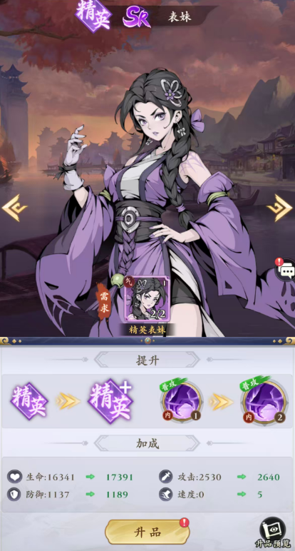 关于侠客培养深度:SR品质侠客最高可升至5星;若目标是快速达成1000级满级,建议待品质提升后再集中投入资源,否则等级上限将受当前品质制约。升品过程中,若无本体需求,推荐优先消耗同阶其他SR侠客作为材料,规避误用高阶侠客的风险。系统提供「一键升品」功能,操作便捷,但需注意:被动技能仅在侠客品质达到「传说+」后方可激活。