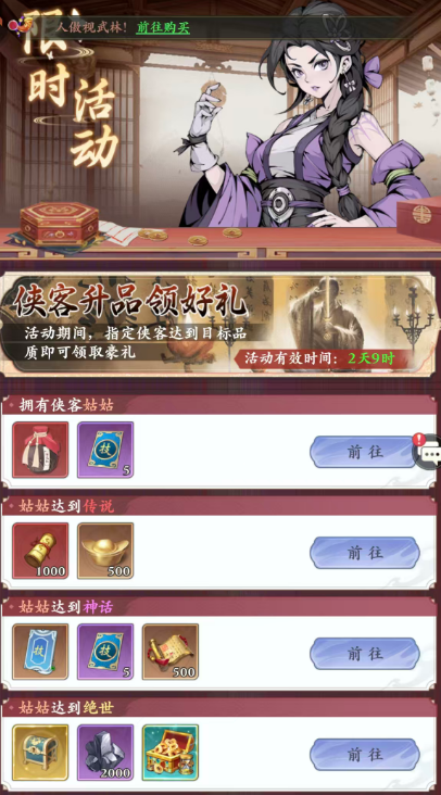 若铜钱储备紧张,新人专属活动是重要补充来源。其中常规任务难度适中,完成后所获铜钱与元宝已基本满足前期消耗;限购任务则需根据自身资源规划理性参与。特别推荐「无双好礼」活动,该活动可稳定获取神话品质侠客,是构建初期主力阵容的高效捷径。