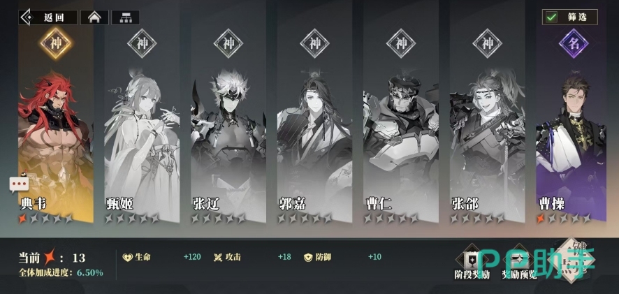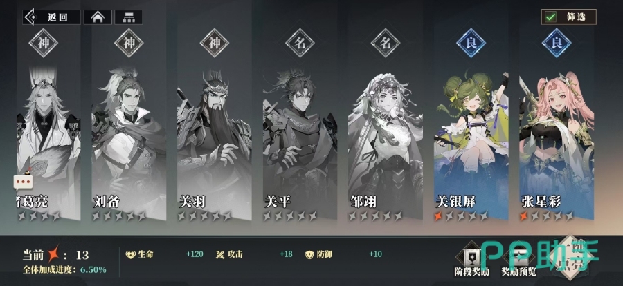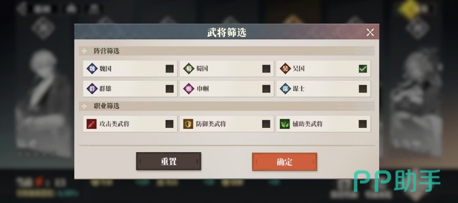 游戏中的这些武将按照阵营可以被清晰地划分为魏国、蜀国、吴国、群雄等几个大类,为了更细致地展现武将们各自独特的特点,游戏还进一步将他们划分为巾帼和谋士等类别,而如果按照职业来进行筛选的话,又可以分为攻击类、防御类、辅助类,不同类型的武将在激烈的战斗中发挥着各自独特且关键的作用,从资质方面划分则可以分为良将、名将、神将以及无双等不同等级。