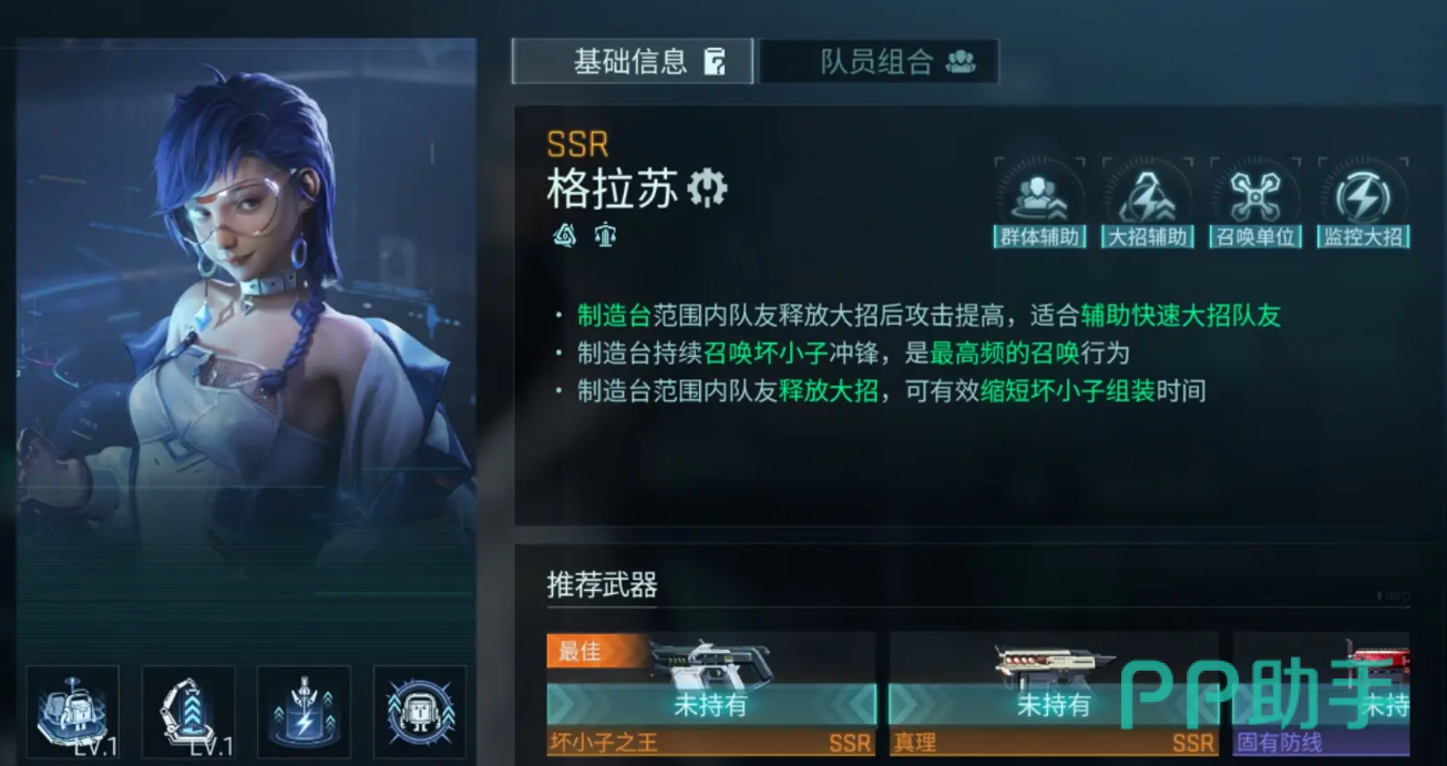 格拉苏是一名工程类支援型角色,擅长布置各类战术装置。她的制造台不仅能缩短范围内友方单位的大招冷却时间,还能持续生产“坏小子”自爆机器人向前冲锋。若有队友在制造台影响区域内释放大招,还可进一步加快机器人的组装速度。这意味着她既能增强团队输出节奏,又能提供额外的战场清场能力。