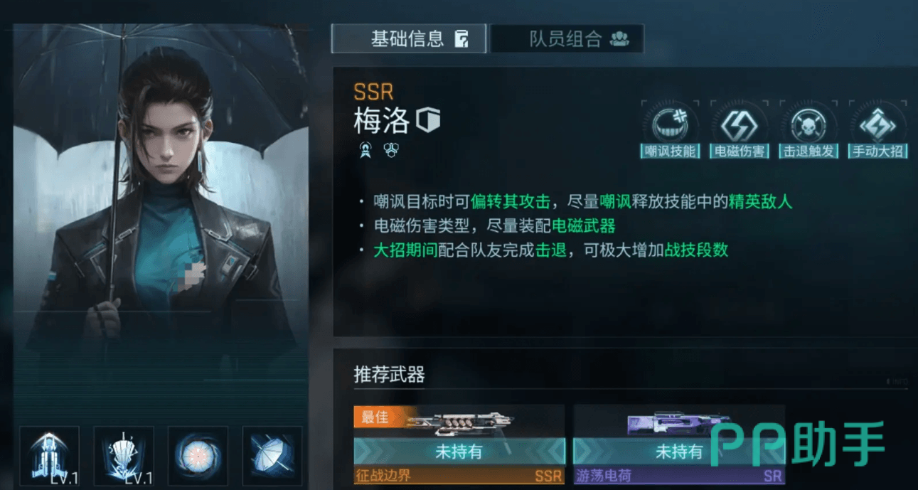 梅洛是一名具备高防御属性的重装型角色,能够通过嘲讽机制吸引敌方火力,有效保护后排单位。她在面对精英单位时尤为实用,因其可偏转敌人的攻击方向。此外,她的终极技能还能与队友配合实现击退效果,在控制与承伤方面表现突出。