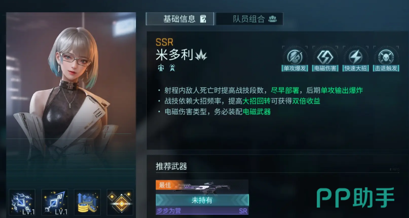 作为初始即可获得的角色之一,希·西雅主要承担侧翼输出职责,擅长针对单体目标打出高额爆发伤害,同时具备一定的群体打击能力。“使命必达”技能可对锁定敌人进行持续6秒的扫射攻击,若攻击处于其侧击位置的目标,则伤害提升25%。“脉冲陷阱”在能量充满后可部署一个自动攻击周围三格范围内敌人的装置,每场战斗最多生成3个。她的天赋“战为自由”可在脉冲陷阱存在时叠加自身伤害加成;而“矢志追随”则能降低陷阱部署费用2点,并使每次出场都增加1个陷阱上限。