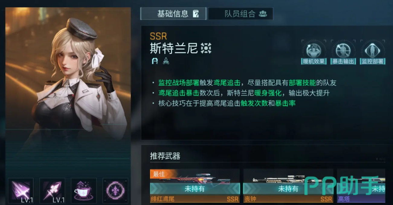 斯特兰妮是一名拥有超远射程的狙击型角色,可精准打击掩体后的敌人。她携带鸢尾追击系统,配合具有部署技能的同伴协同作战效果更佳。每当鸢尾成功触发暴击一定次数后,斯特兰妮自身将获得显著强化,大幅提升输出能力。因此,提前部署并优化鸢尾追击触发频率与暴击率是使用她的关键所在。
