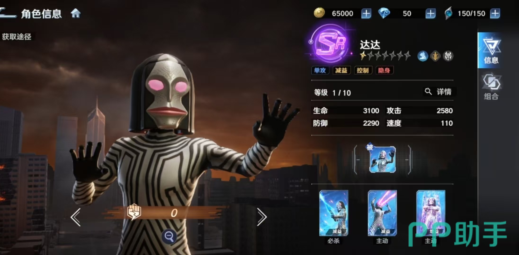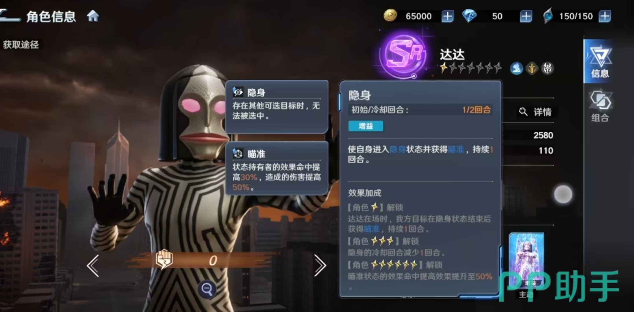 游戏整体采用策略卡牌驱动机制,角色强度高度依赖技能协同与站位配置。因此,对单个单位的机制拆解尤为关键。达达的核心能力聚焦于单体压制与生存强化:具备减益施加、控制触发、隐身规避三重功能标签。其被动“突袭”机制明确——当达达处于场上时,我方单位结束隐身状态后,将自动获得“瞄准”效果,提升30%效果命中率与50%伤害输出,持续一回合。