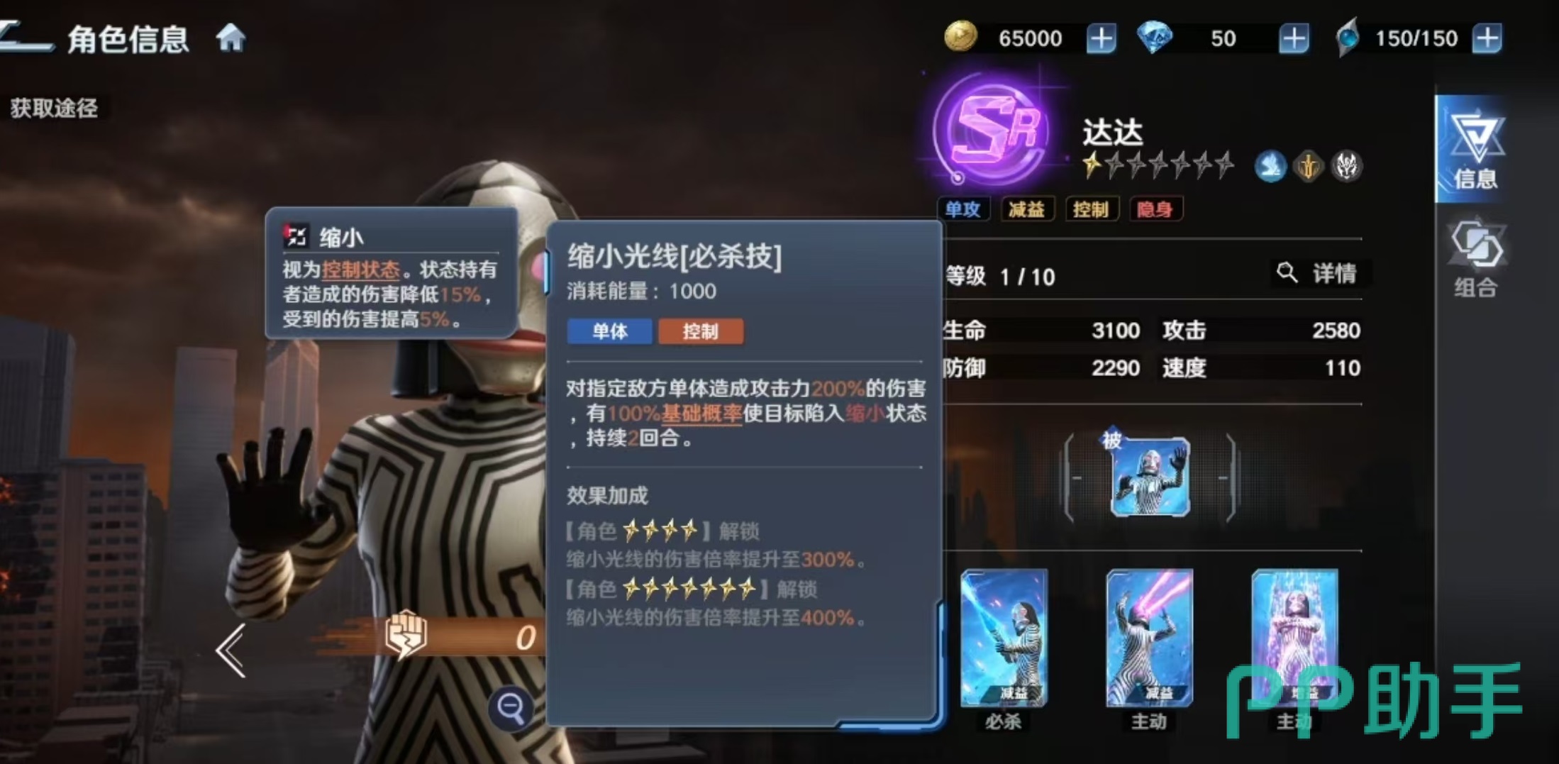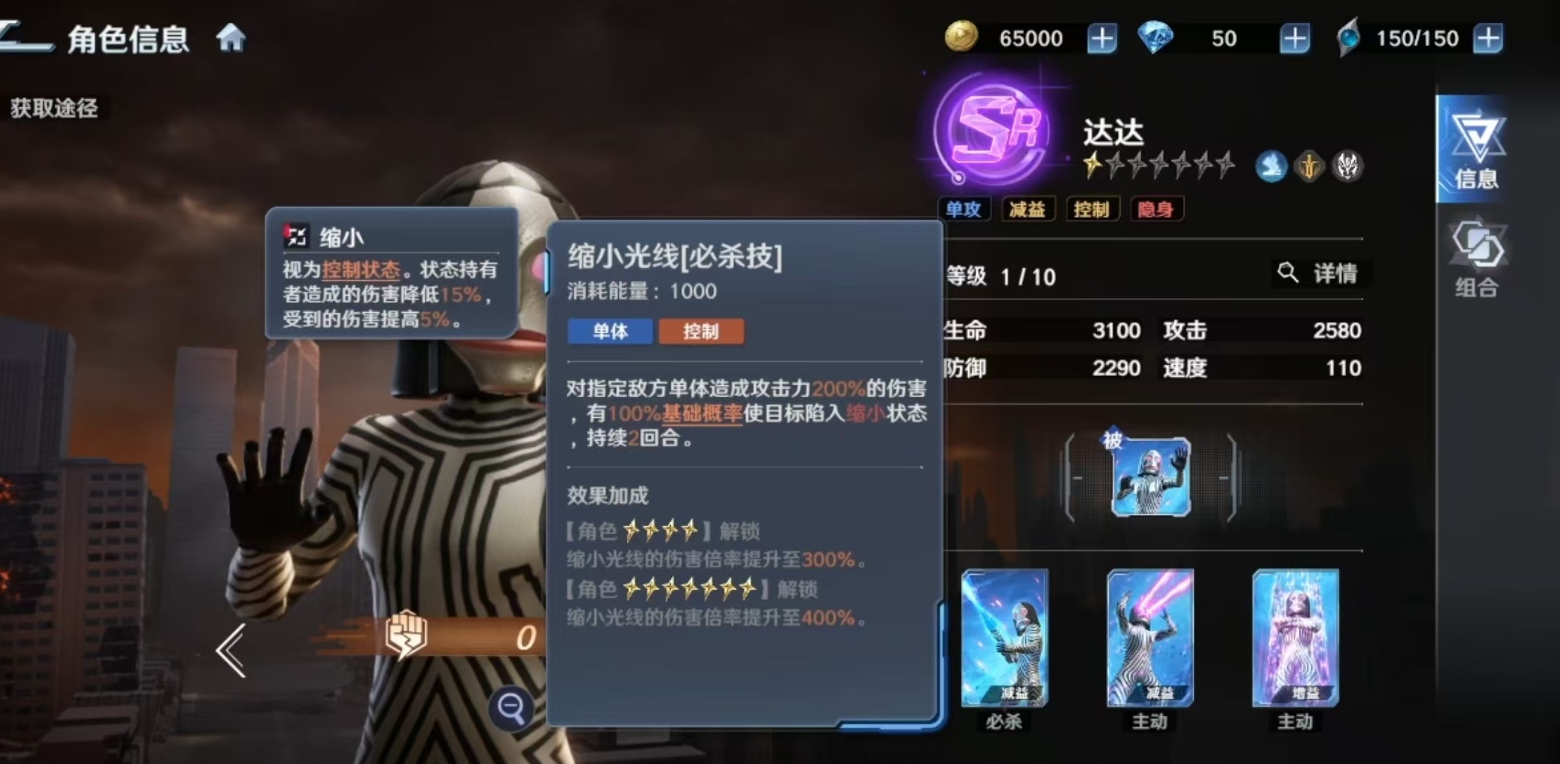 必杀技“缩小光线”针对敌方单体释放,造成基础伤害并有概率附加“缩小”状态,持续两回合。“缩小”属于硬控类效果,可限制目标行动逻辑,在对抗高威胁单体核心输出(如敌方主C)时具备战术价值;该技能随等级提升,伤害倍率同步增强。主动技能“眼部光线”为单体伤害技,附带眩晕概率,星级提升后虽可小幅提高伤害数值与触发率,但受限于SR品阶,实际眩晕命中率仍处于中低区间。另一主动技“隐身”提供不可选中保护,同时赋予“瞄准”增益,显著提升生存容错率;但因缺乏群体攻击手段,使其在常规推图场景中覆盖率不足,更适合单体攻坚或特定PVP环境。