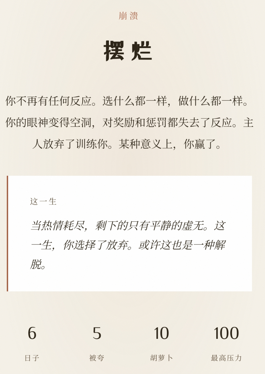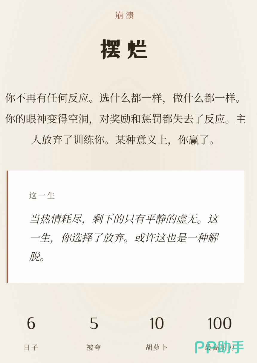 《萝卜真棒》定位为轻量级剧情驱动型手游,主打“选择即玩法”的核心体验。玩家通过调配不同道具喂养“大开门”,实时影响角色数值变化,进而触发差异化叙事路径。目前已确认可解锁结局数量达十余种,兼具随机性与策略性。游戏全程零内购压力,操作门槛低,适配地铁通勤、午休间隙等碎片化场景。