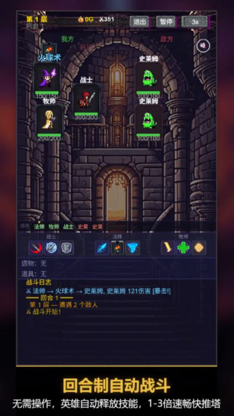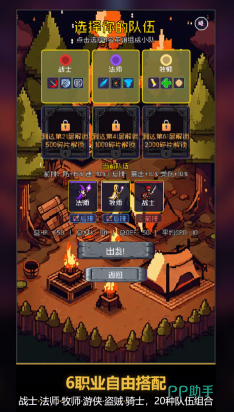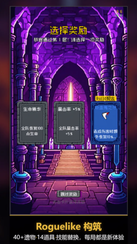 游戏采用竖屏黑暗美学风格,开局即进入沉浸式叙事场景。玩家需从六大职业中任选三位组建初始小队,角色具备差异化主动技能与专属被动效果,战斗全程自动释放,专注策略搭配而非操作微操。向上攀升过程中,玩家将持续遭遇变异精英怪、触发随机剧情事件,并拾取具有成长加成的遗物道具,逐步强化队伍生存与输出能力。